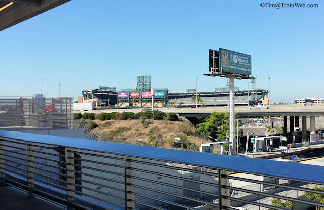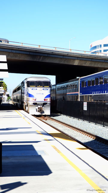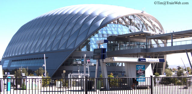Waiting for the 10:36 arrival of the Surfliner looking northeast from platform with a view of the ARTIC and then southwest to Angels Stadium.