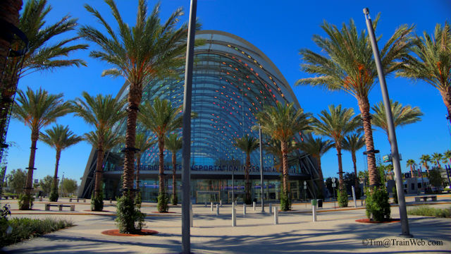 I arrived at the Anaheim Amtrak/ARTIC after jumping off the Southwest Chief in Fullerton and catching the 564 edition of the Surfliner, arriving a little after 8:30 AM. Already knowing that I would miss the 566 Surfliner I had to hustle to make the 10:36 AM departure. I bought a day pass to the ART for $5 - a more than fair (fare) price for the number of round trips I would be taking that day. The Anaheim Resort Transportation service is a door to door shuttle that operates around hotels and other areas near Disney. It is a personalized option to the OCTA bus #50 that runs down Katella Ave. After dropping my bags of that the La Quinta Inn & Suites, I re-boarded the ART for a ride back to the Anaheim Amtrak station. This new transportation center is a marvel to look at, achieving LEED Platinum certification.