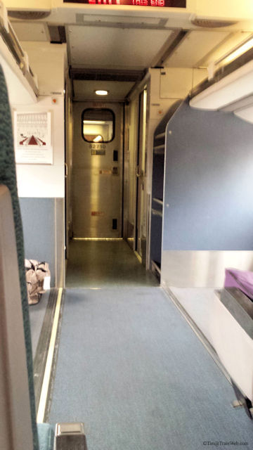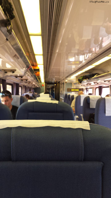 An interior view of the Surfliner car shows a modern style and clean lines on the left. Each seat has 120v power and are quite comfortable. These cars are nicer than the Amfleet II cars used in corridor service back home in Illinois on the right.
