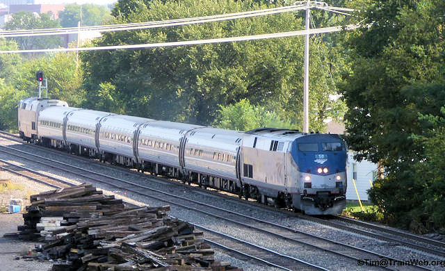 Lincoln Service in Bloomington, Illinois with a P42 pulling an Amfleet II consist southbound towards Springfield.