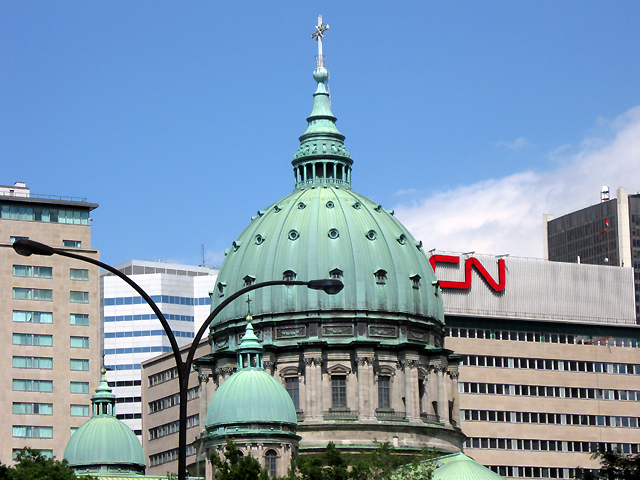 Cathedral stands in front of Gare Centrale as seen from Le Centre