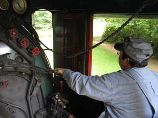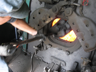 Fireman David Bradley watches ahead as 190 passes the train shop