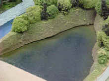 The lake in these photos was made using a wavy textured piece of bathroom panel. The panel was painted with earth tones near the shore and an indigo color in the middle. The final coat of paint was a sprayed on clear acrylic coat. Notice the reflection of the shore and trees in the "water".
