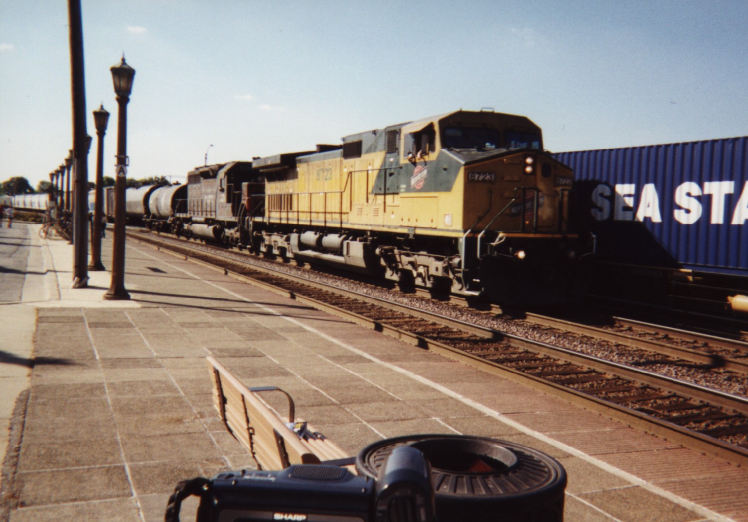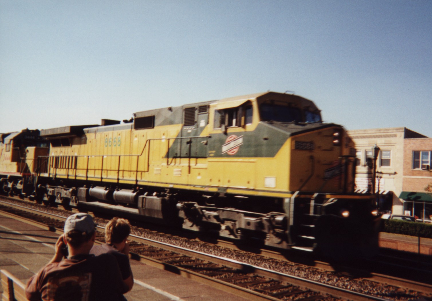 East bound with C44-9W CNW 8668 freight thru Elmhurst, Ill Say Hi Glen and Neil, Glen is wearing the Baseball Cap.