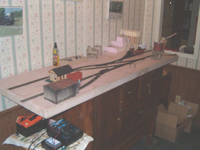The On30 layout is coming along nicely, I've put it on top of the cabinet in the Dining room and have placed the structures on it.
