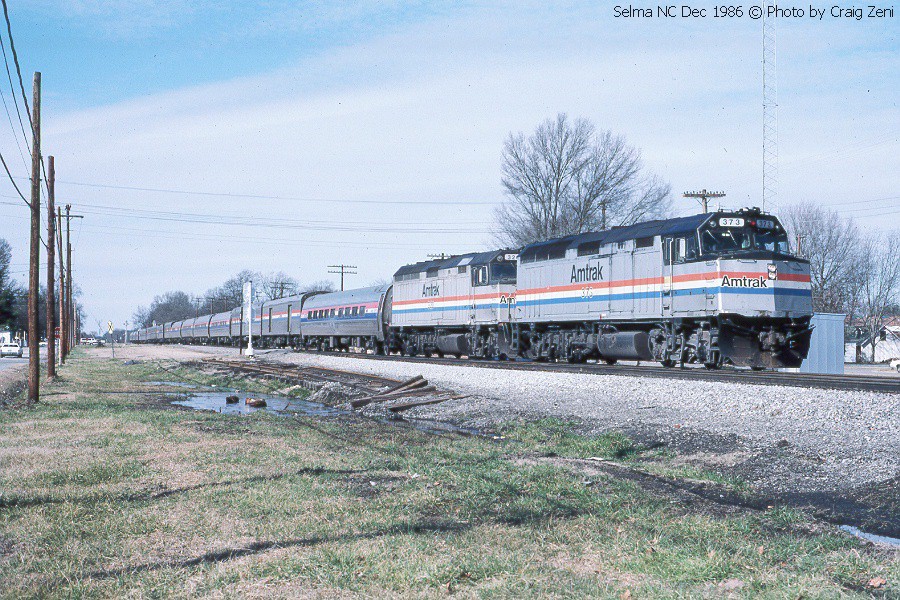 In December 1986 Amtrak 373 leads Train 82 The Silver Star into Selma NC. The train had only started using this routing three months earlier, after CSX abandoned the old Seaboard Air Line main line north of Raleigh. |