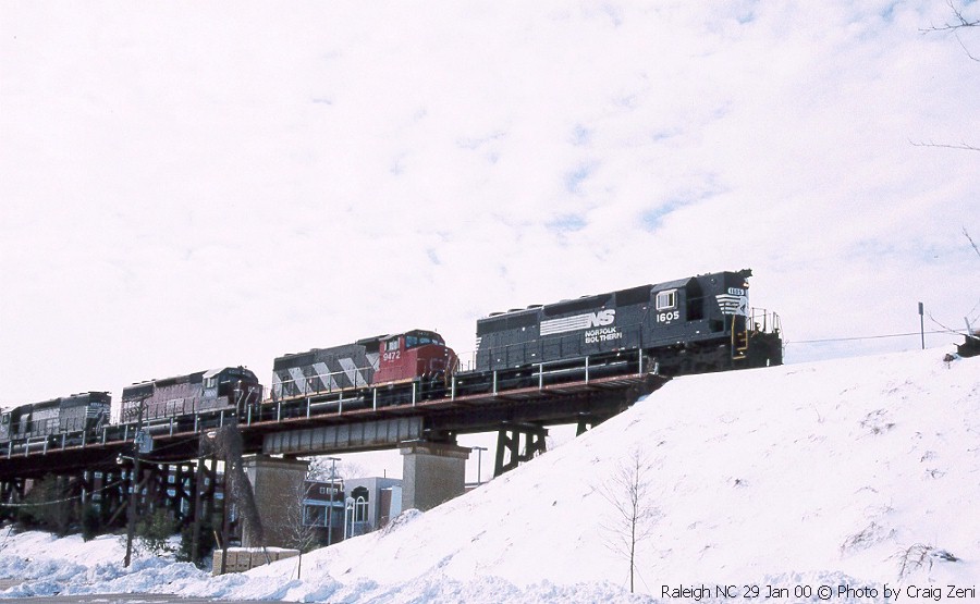 On train 352 NS SD40 1605 leads a curious power consist across Raleigh's Smoky Hollow viaduct on 29 January. Smoky Hollow is a low lying area between Peace Street and Boylan Heights in Raleigh, and was a working class neighborhood into the 1905s. It takes its name from the way smoke from the wood and coal stoves used to heat the shotgun houses would lay down in the hollow. The houses were urban-renewaled into oblivion forty years ago.
