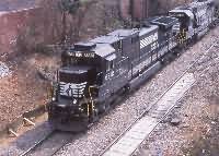 "Top Hat" C40-9 8812 has just come downgrade through the NC State University campus, made the turn at Boylan and is crawling toward the Smoky Hollow viaduct and into Glenwood Yard.in March 1999. |