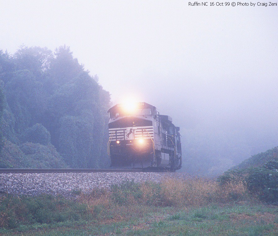 Blasting out of the fog, NS 8952 leans into a curve on the old Southern Rwy main line at Ruffin, North Carolina in October 1999. |