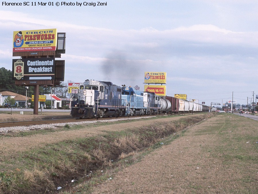 Can you tell we're near the Interstate? On 11 March 2001 South Carolina Central 8383 heads a good 80 cars away from the CSX interchange at Florence SC. Part of the train will be set out in Darlington SC, part of it at Floyd SC, and some trash cars go all the way to Bishopville SC. That trio of pure EMD 567 engines sounded so sweet. |