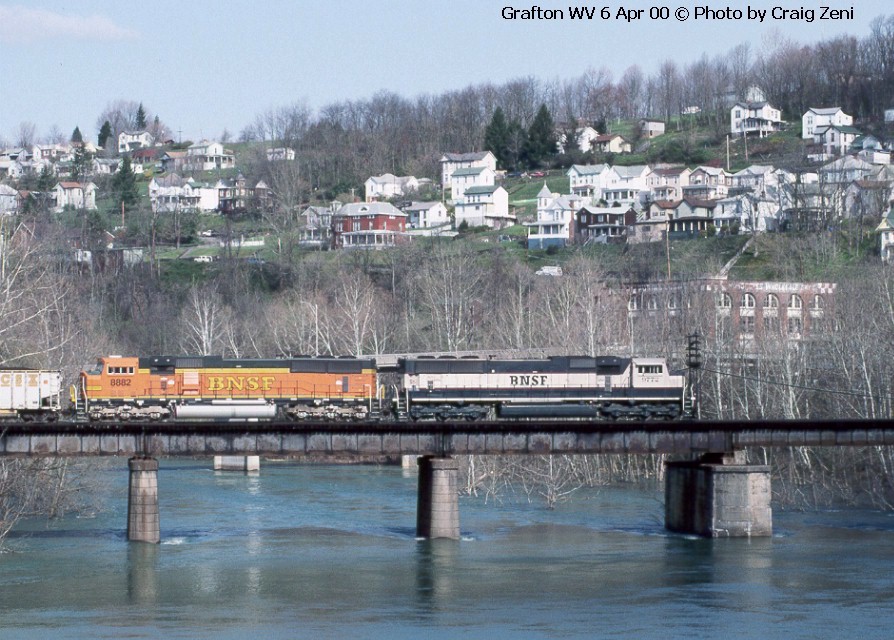 | A real surprise to find prowling the coal fields of West Virginia, a pair of BNSF SF70MACs lead a coal train across the Tygart River and into the yard at Grafton. | |