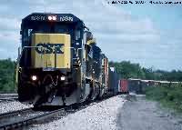 | On that same long stretch of tangent track mentioned on page 1, ex Conrail SD60I 8723 cruises down a grade with Q400. At Pembroke he'll turn north for Cumberland, Maryland. To see the new friend we made while waiting for this train, click here. | |