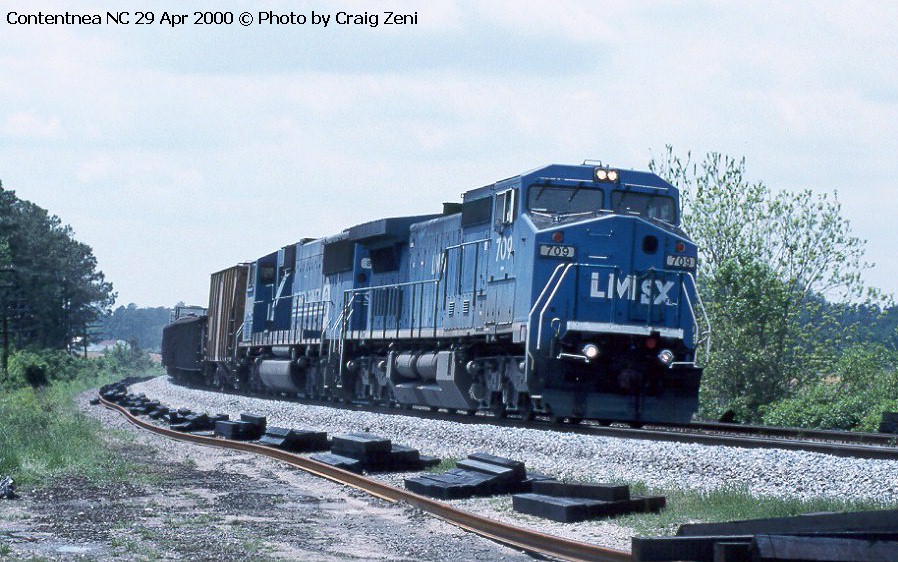 | Leaning into the turn at Contentnea past the detrius of a tie gang, hastily restenciled LMSX 709 pulls train Q410 northward. This train originates in Waycross, Georgia and terminates in Selkirk, New York. Not visible in this view but soon to visible in any shot here is a new set of highway overpasses guaranteed to spoil this view. | |