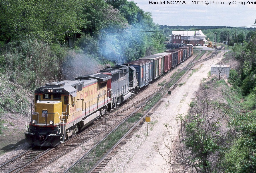 | Formerly a Southern Pacific engine, UP 5631 is heading west from Hamlet station with train Q615 bound for New Orleans. Trains like this make one wonder just whose railroad one is watching... | |